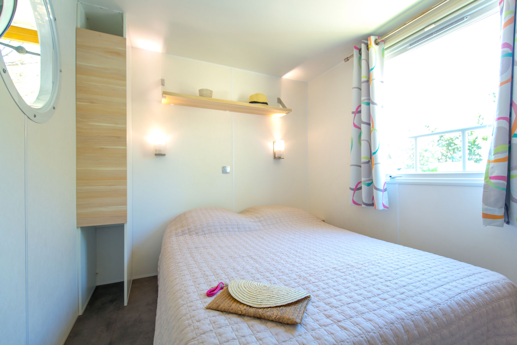 • Chambre avec lit double (lit 140 x 190 cm) • Chambre avec deux lits simples (lits 80 x 190 cm) • Climatisation • Télévision • Salle d’eau et WC séparé • Terrasse couverte • Salon de jardin • Bains de soleil • Stationnement pour une voiture