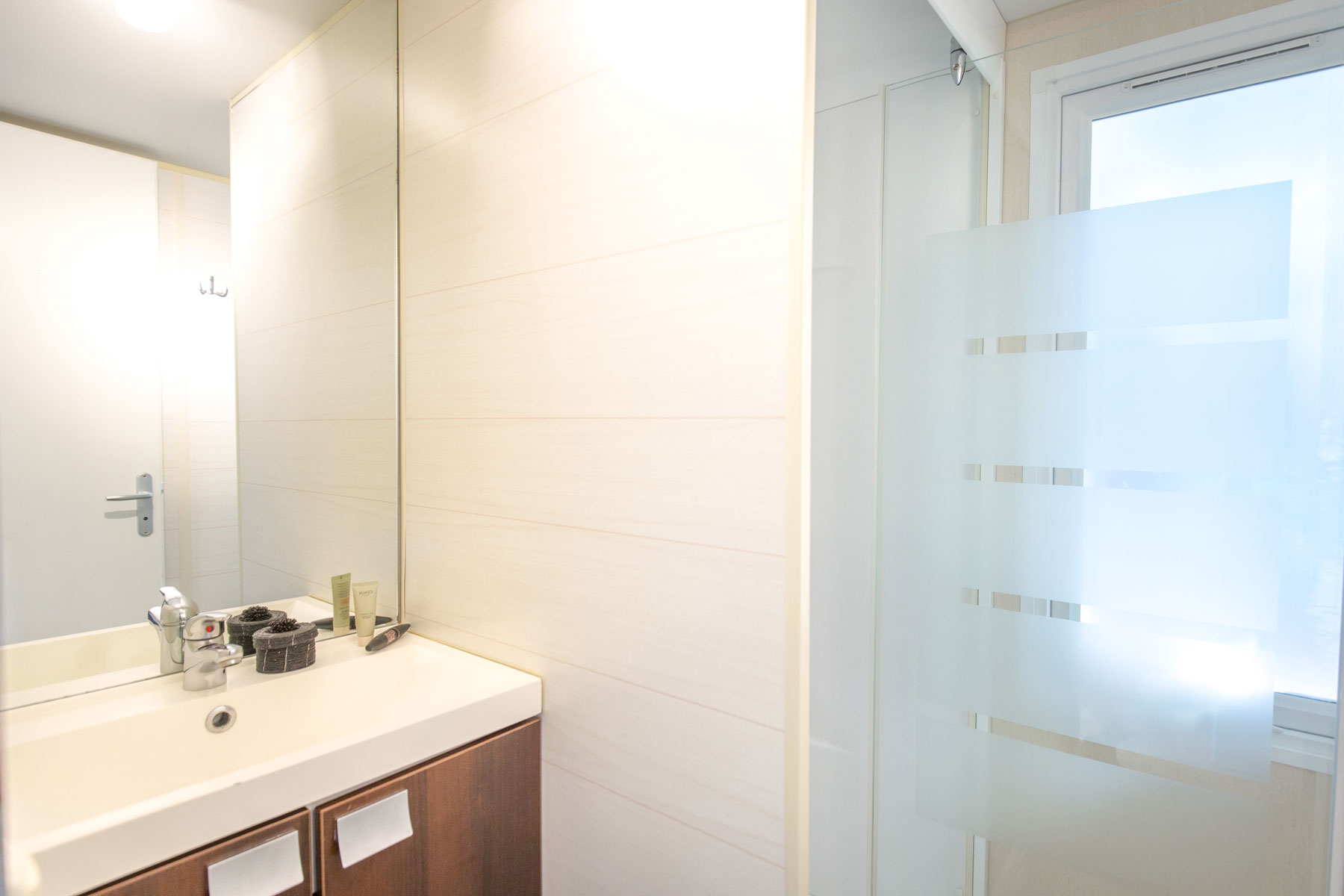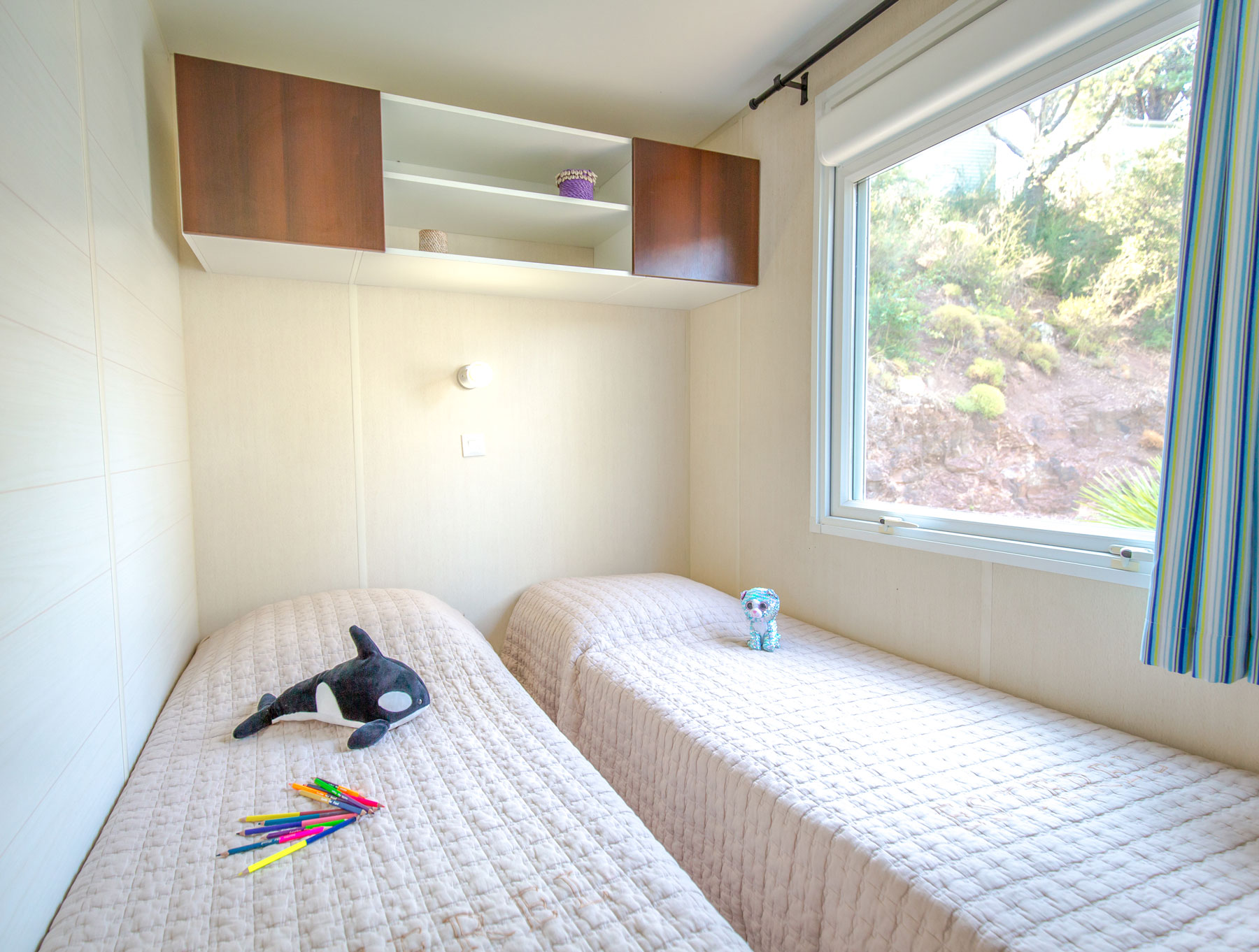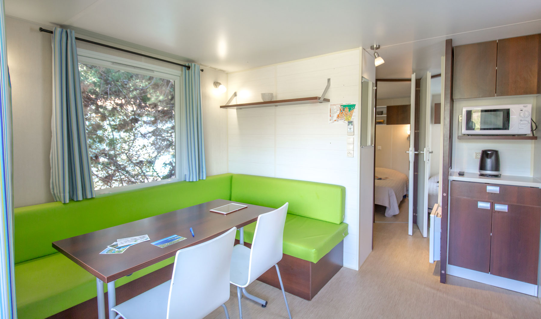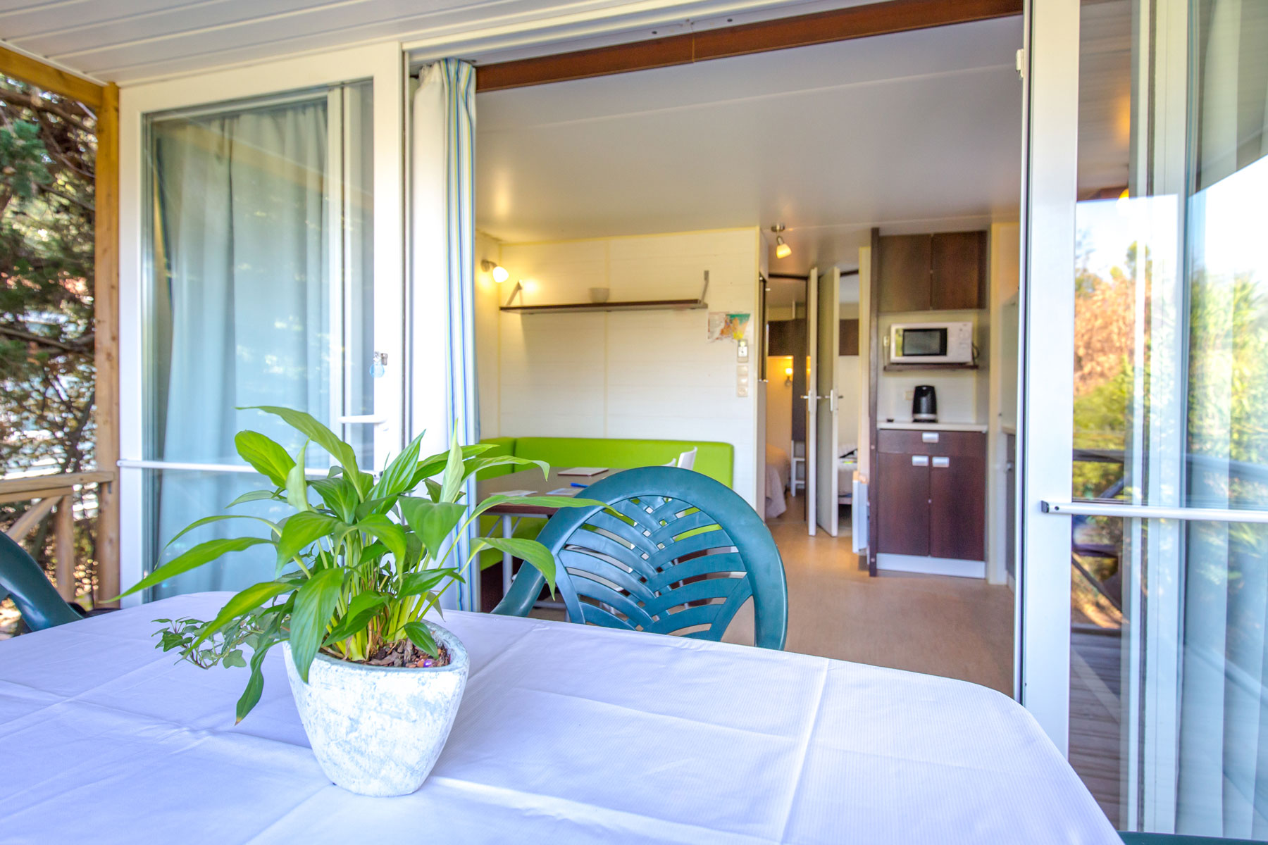 Il comprend une terrasse intégrée couverte qui vous offre une vue sur le Massif de l’Esterel. Tous les mobile home Villa sont installés dans le quartier Cirque Haut du camping. Proche du centre du camping, très lumineux, ce mobile home est très fonctionnel :