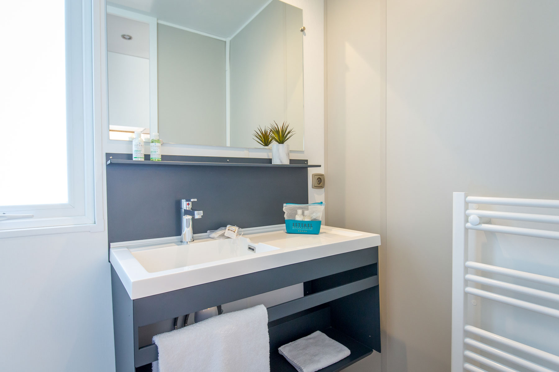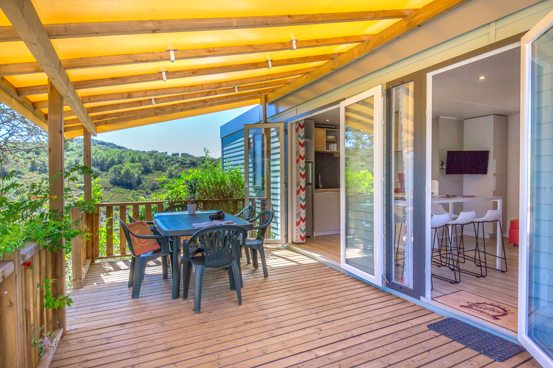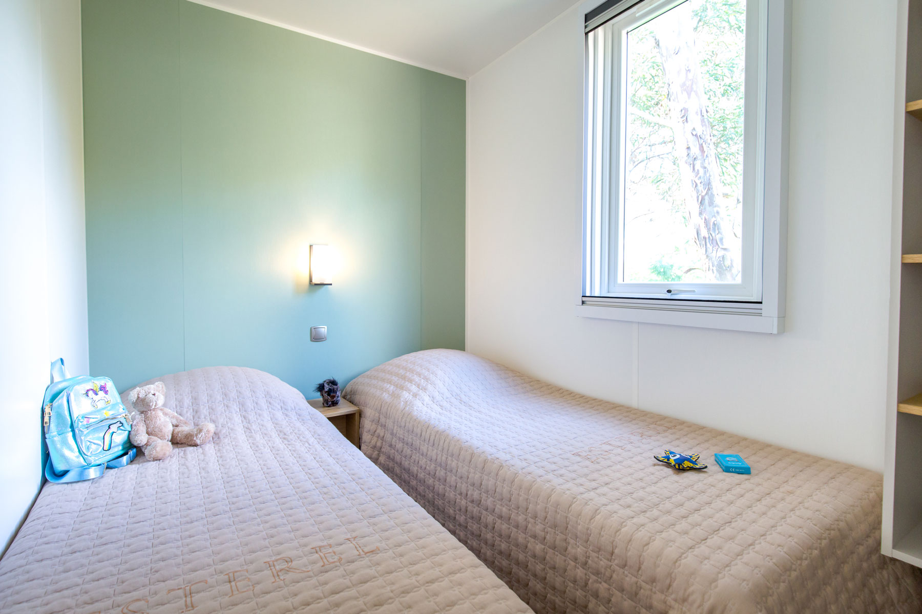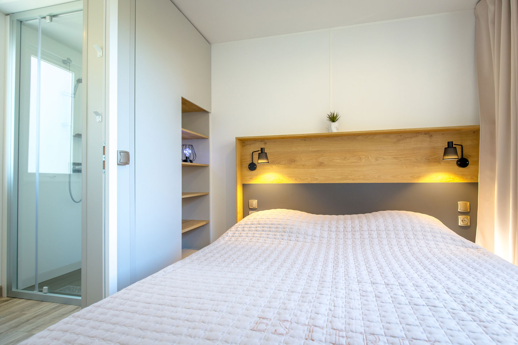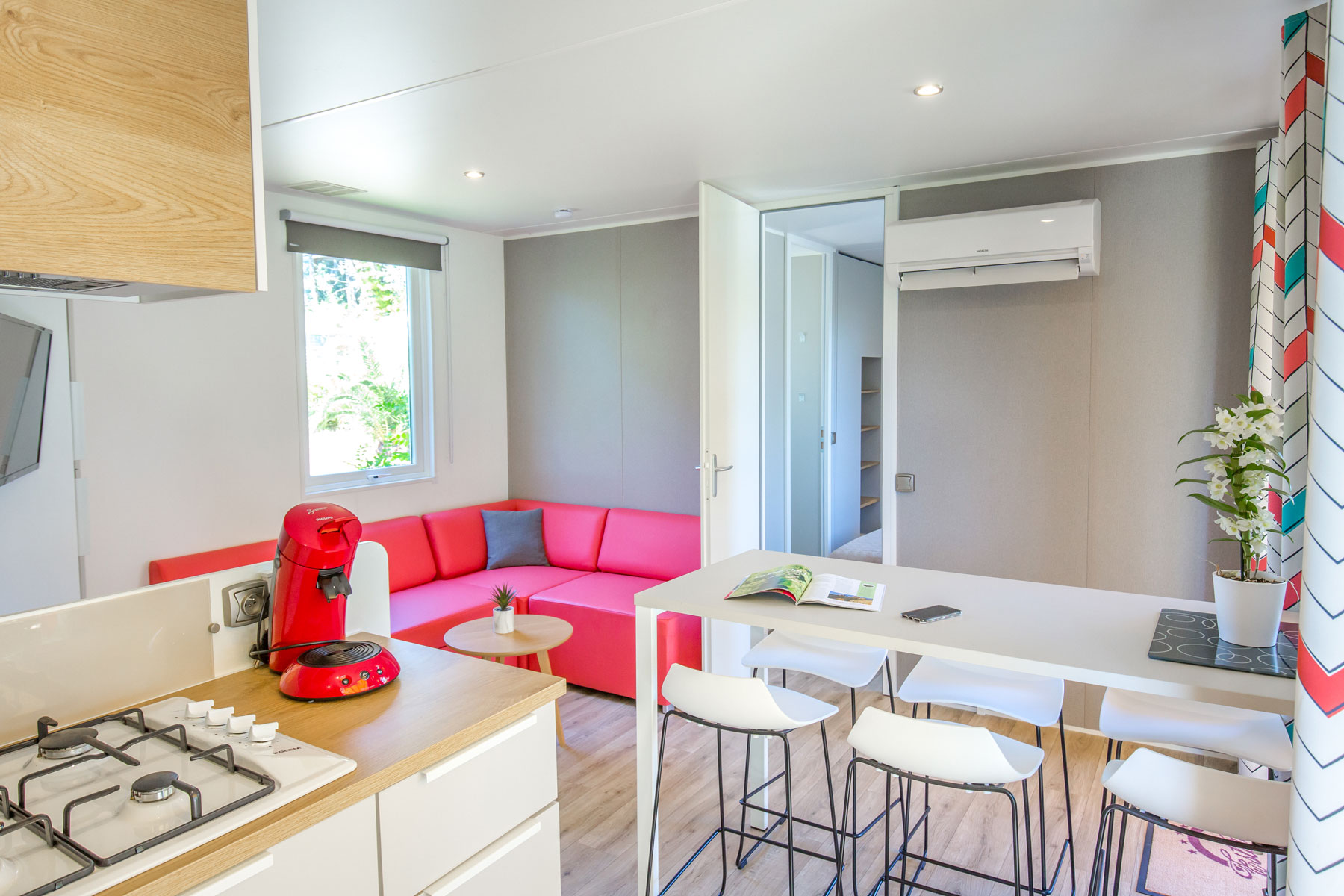 Le Family Cottage est le mobil-home parfait pour de confortables vacances avec ses 3 chambres et ses deux salles d’eau. Pouvant accueillir jusqu’à 8 personnes, il comprend d’une part, une vaste Suite parentale accédant à une salle d’eau avec WC privatifs et d’autre part, deux chambres avec 2 lits simples, dont une avec Mezzanine. La cuisine d’été est ouverte sur l’extérieur pour profiter de la douce lumière de la French Riviera et est équipée d’un lave-vaisselle. Le salon convertible est agencé de manière à vous offrir un maximum d’espace où vous profiterez de la climatisation et de la télévision.