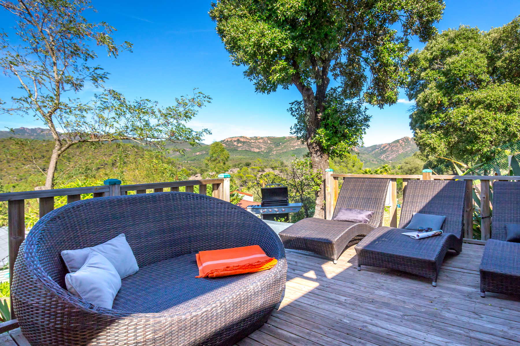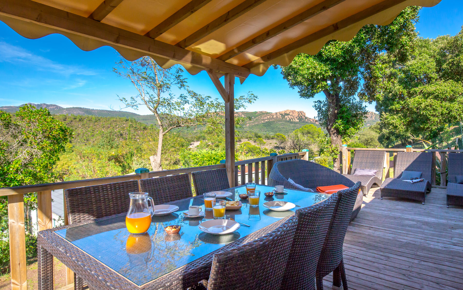 Sa terrasse semi ombragée vous permet de vous retrouver autour d’un dîner convivial afin de profiter d’un paysage exceptionnel et de couchers de soleil incroyables sur les roches rouges du massif de l’Esterel.
