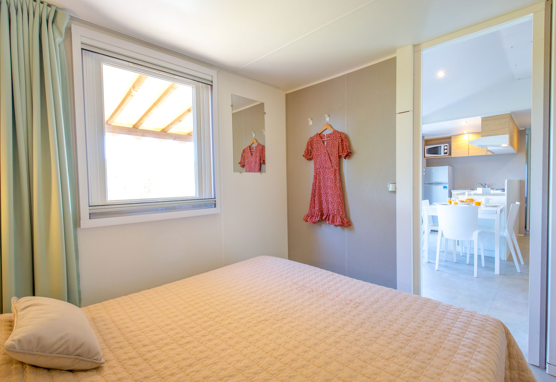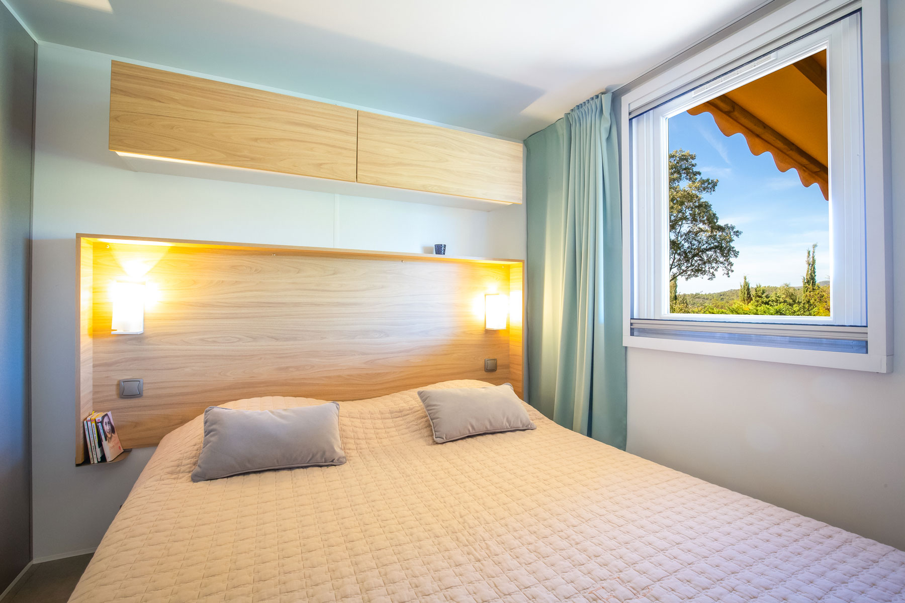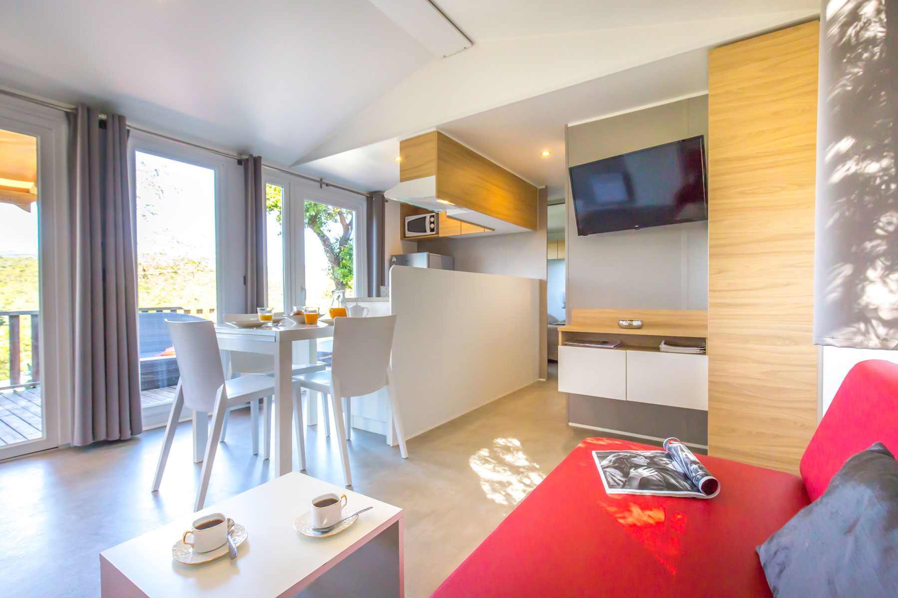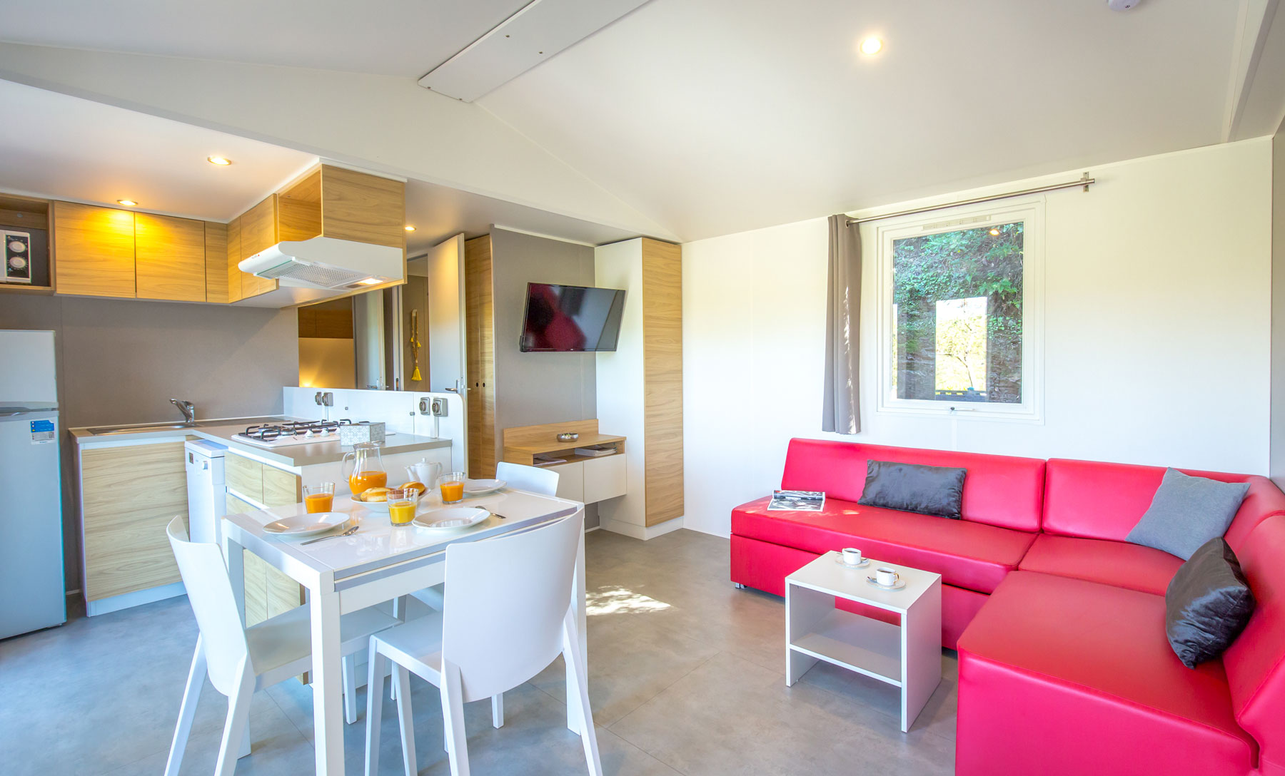 Le mobile home Premium est ultra moderne, spacieux, chic et lumineux. Du haut de gamme pour des vacances exceptionnelles en famille ou entre amis. L’intérieur, au design contemporain, avec son salon central et son espace repas séparé lui procurent un confort indiscutable, qu’une grande famille appréciera.