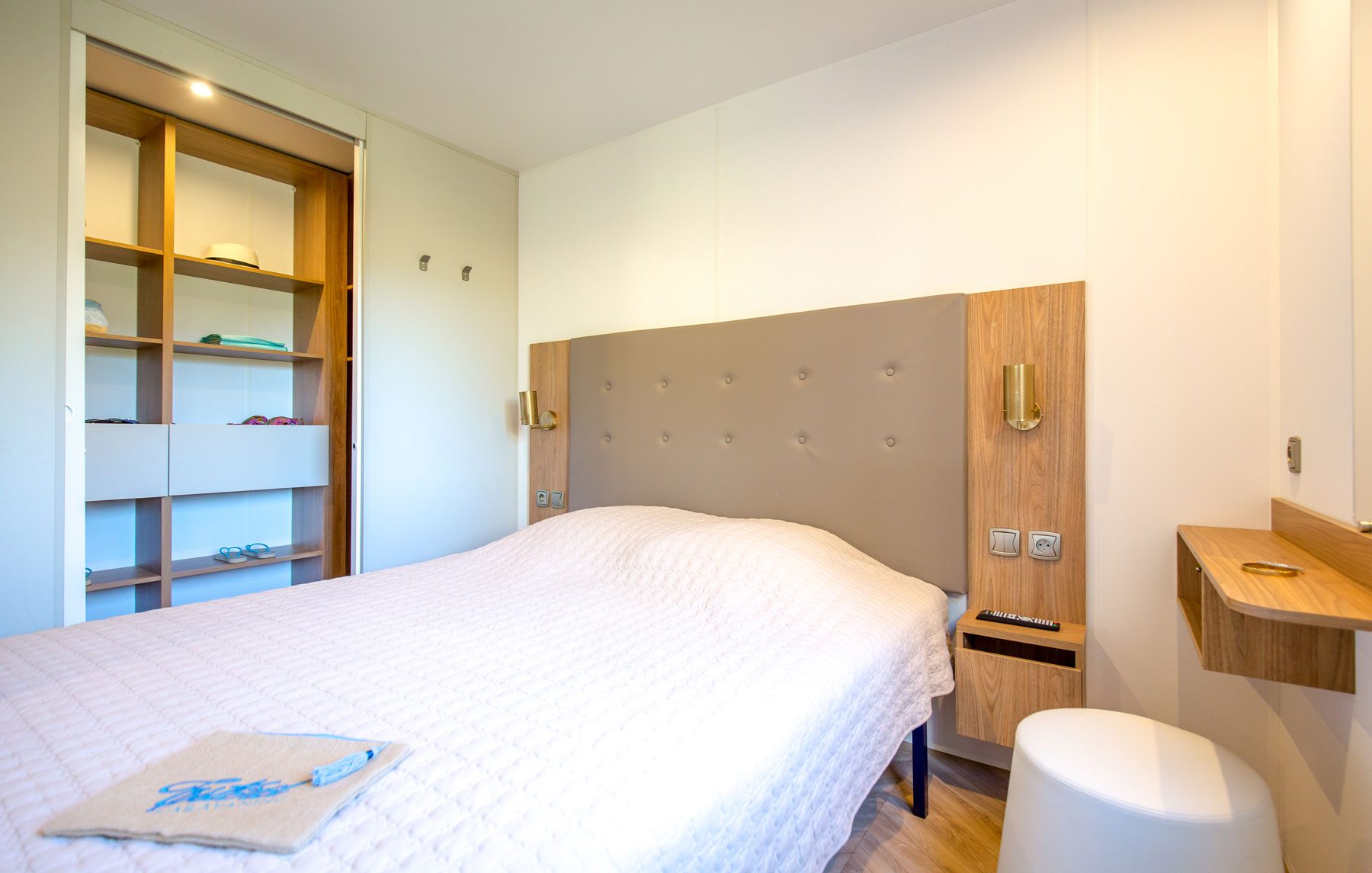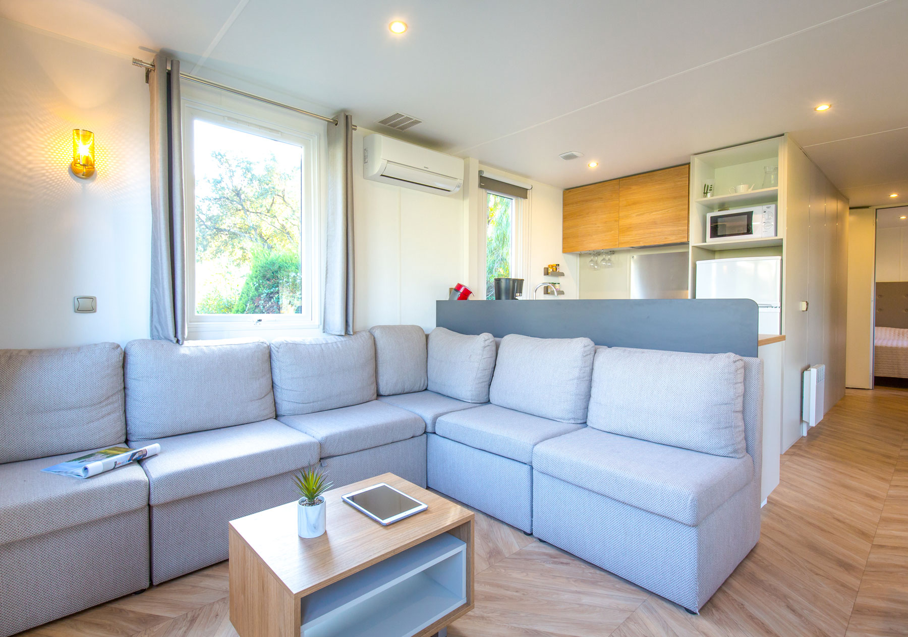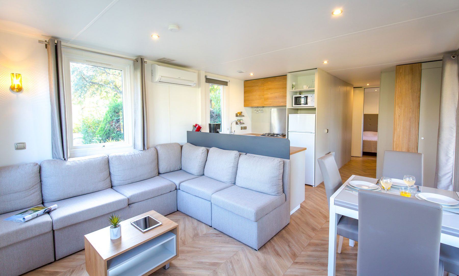 Nouveauté 2020, ce mobile-home de 2 chambres dont une suite parentale avec dressing est particulièrement lumineux et moderne grâce à ses grandes fenêtres.