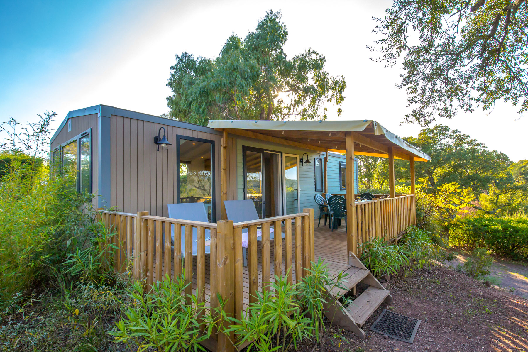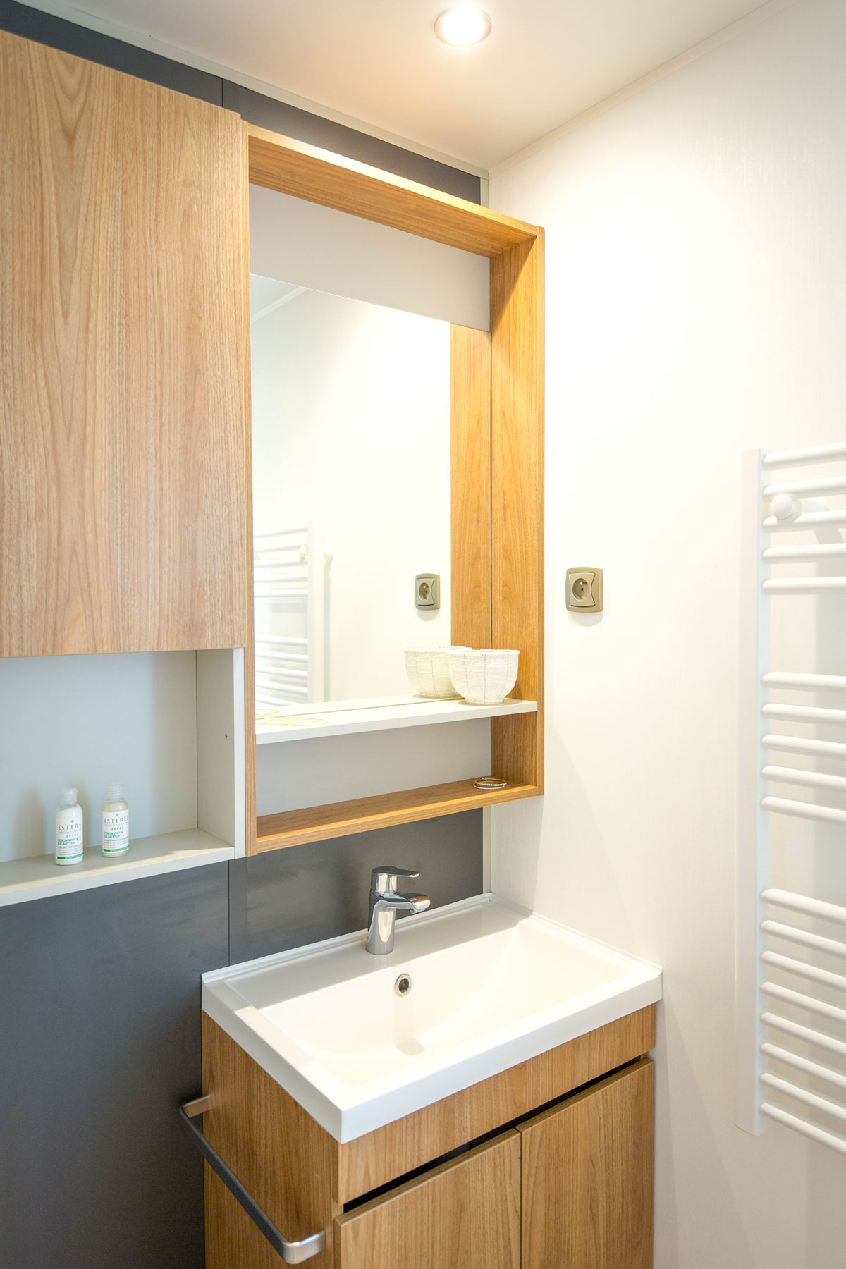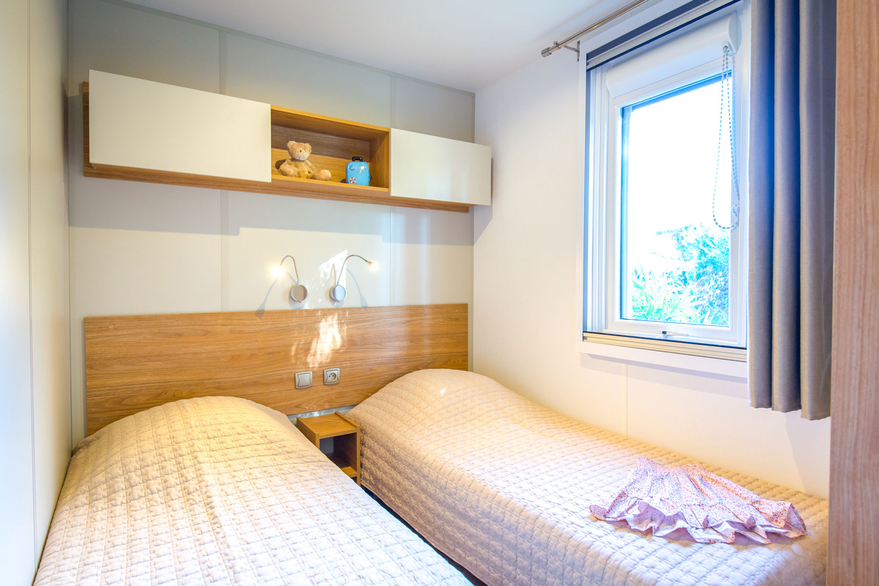 Nouveauté 2020, ce mobile-home de 2 chambres dont une suite parentale avec dressing est particulièrement lumineux et moderne grâce à ses grandes fenêtres.
