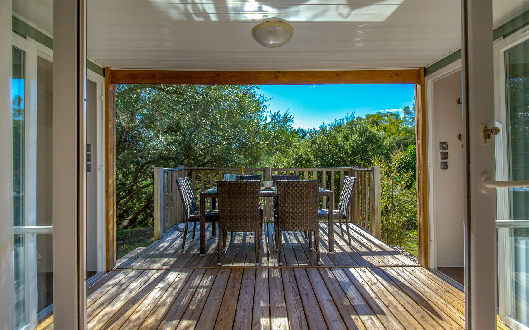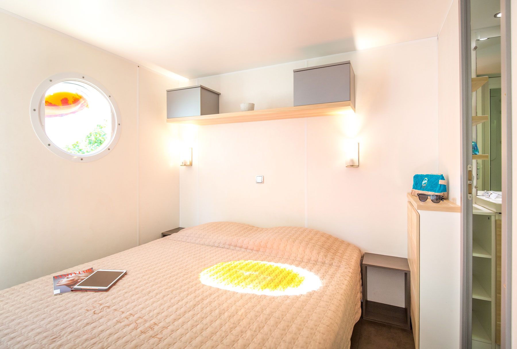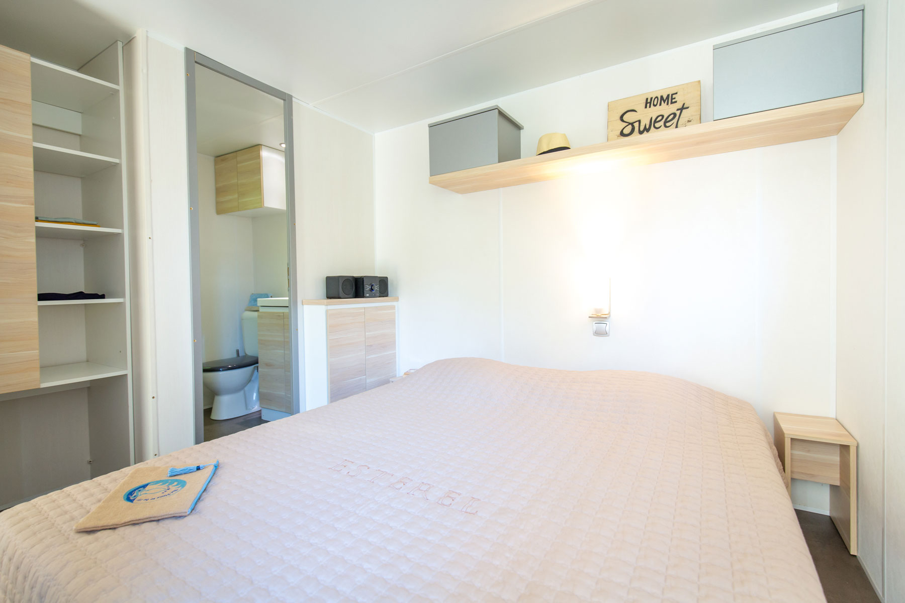 Découvrez les photos des mobile-home Castel pour 4 personnes : 2 chambres et 2 salles de bain avec terrasse couverte.